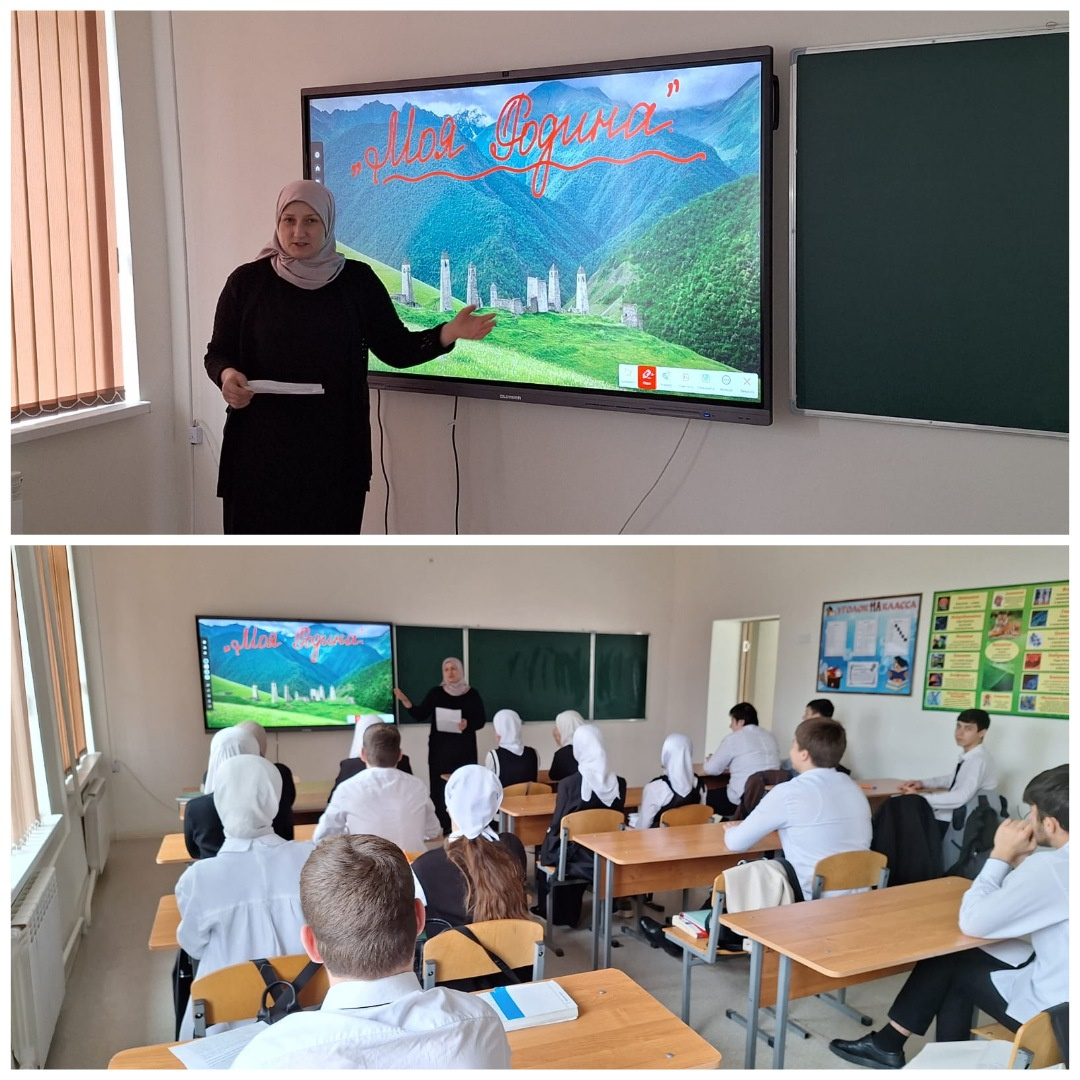 19.03.2024Заместитель директора по ВР Сайдуллаева З.А. провела мероприятие, посвященное Дню Конституции Чеченской Республики "Моя Родина". Где рассказала о своей малой Родине, ее истории и сегодняшнем дне, символах и достопримечательностях.