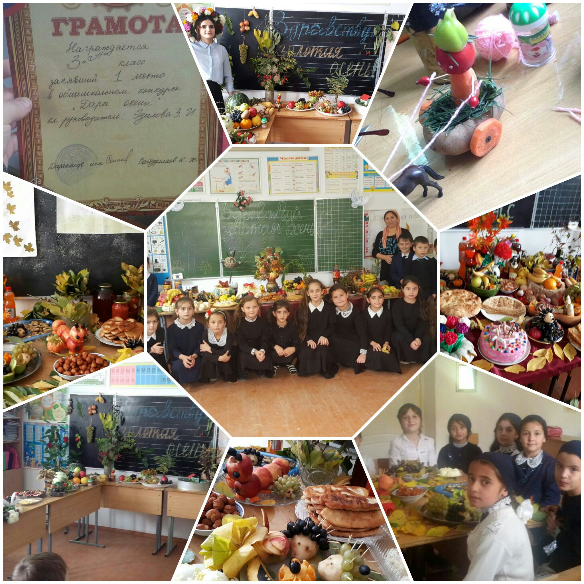 Учителя начальных классов со своими детьми провели конкурс среди классов дары осени. Как мы знаем что осень самое богатое время года. Были победители которые заняли первые, вторые и третьи места. Детям понравилось. В конце провели чаепитие.